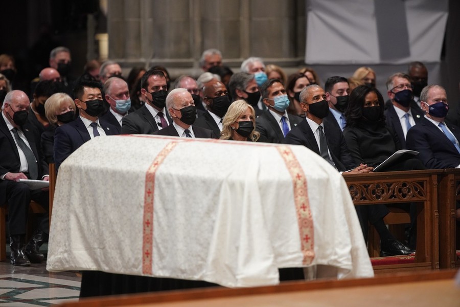 În prezenţa preşedintelui Joe Biden şi a soţiei sale Jill, precum şi a principalilor lideri ai Pentagonului, fosta şefă a diplomaţiei americane Madeleine Albright a evocat „un personaj care aproape a depăşit istoria, virtuţile sale fiind homerice: onestitate, demnitate, loialitate şi un angajament neclintit faţă de profesia sa şi de a-şi ţine cuvântul”.