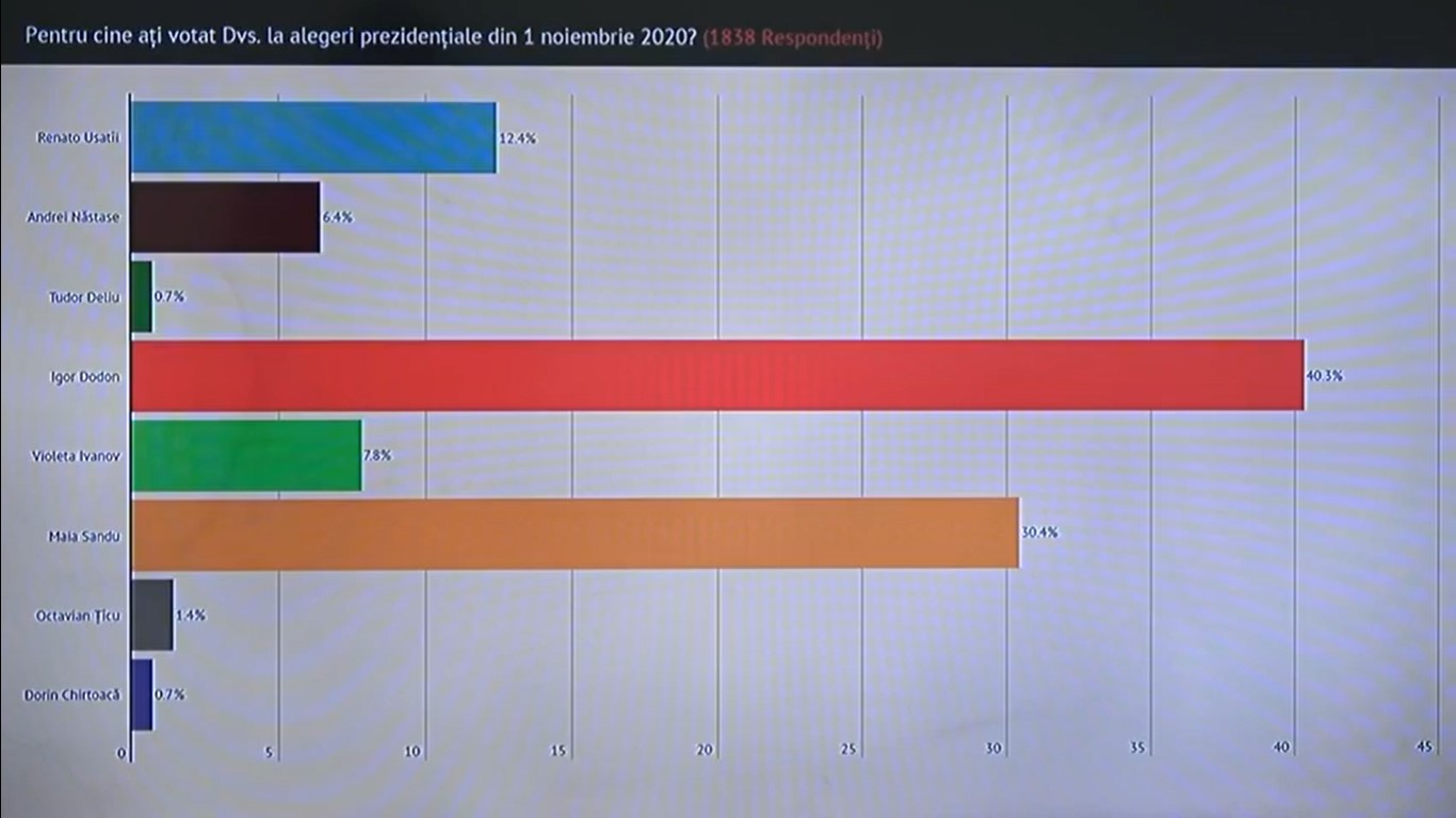 Clasamentul este același și în cazul sondajului realizat de Intellect Group și asociația SPERO. Astfel, Igor Dodon are 40,3%, Maia Sandu – 30,4%, iar Renato Usatîi – 12,4%.
