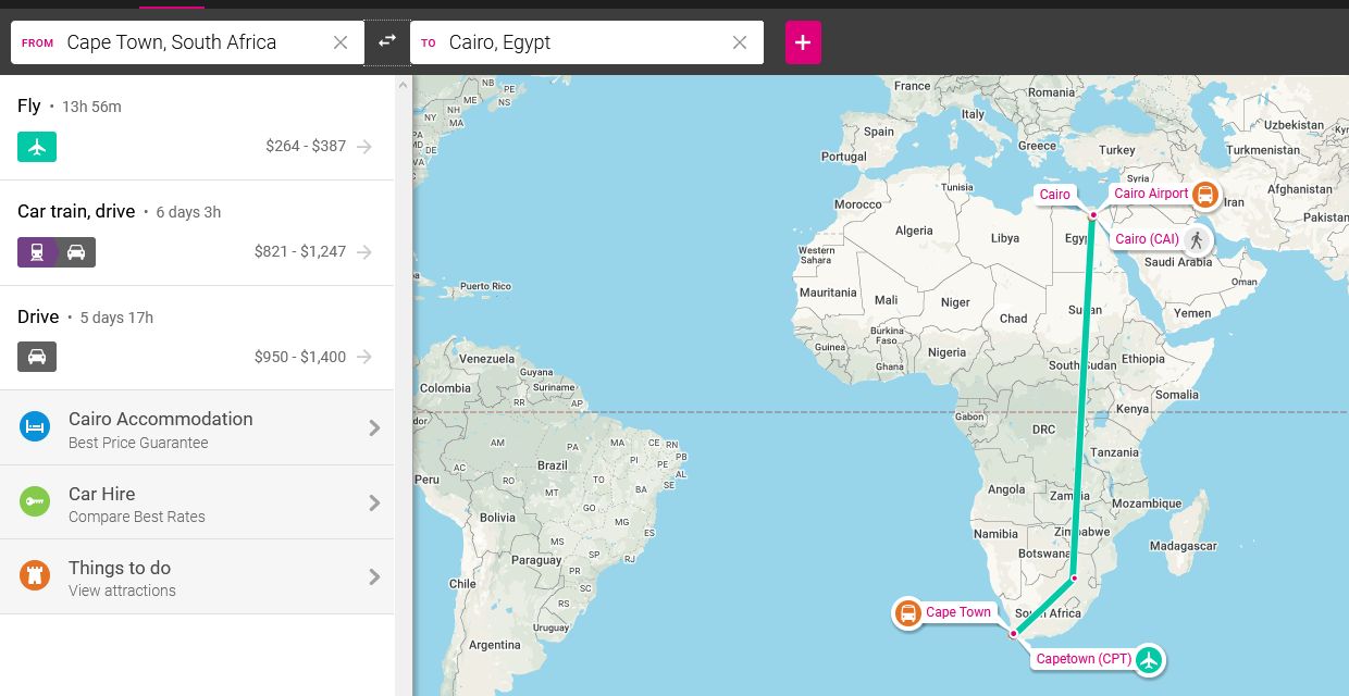 De la Cape Town la Cairo în prezent (sursa rome2rio)