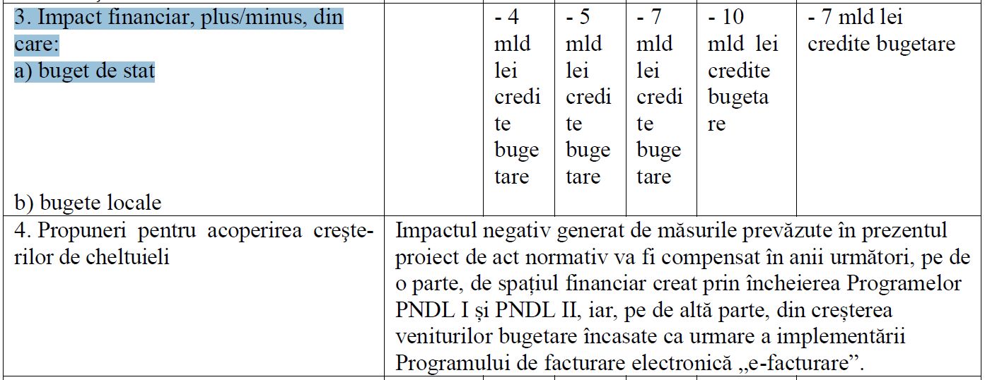 Spre deosebire de proiectele care au fost anterior în consultare publică, de această dată în nota de fundamentare se precizează și ce impact bugetar este estimat: 26 miliarde de euro în perioada 2022-2025, media următorilor 5 ani după anul curent fiind un minus de 7 miliarde de lei.