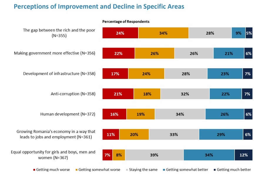 • 24% cred că decalajele dintre bogați și săraci se adâncesc foarte mult, în timp ce 34% spun că se adâncesc mult, 28% că rămân la fel, 9% că scade, iar 5% că scade foarte bine.