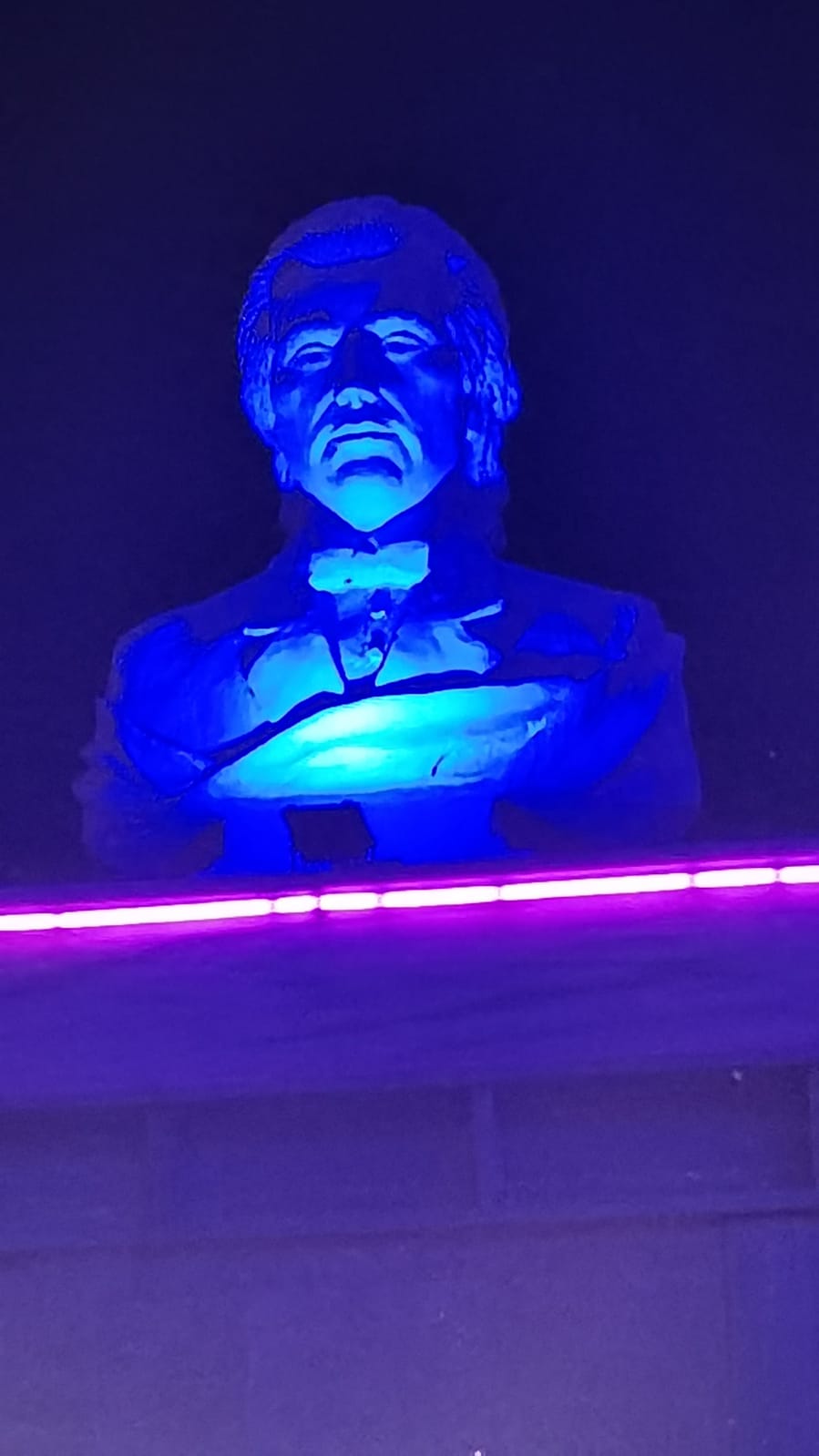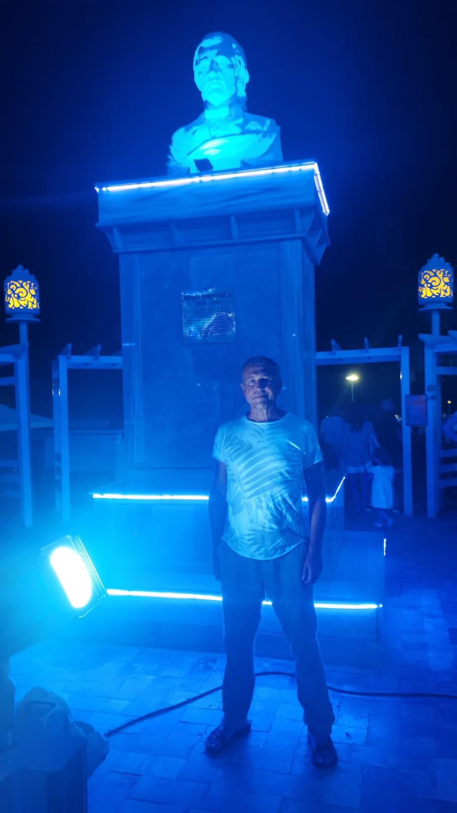 În scăfârliile celor trei bat neaoanele fosforescente. Totul e feeric și psihedelic. Statuile dau sentimentul unei solemnități cretine. Neoane pe fațadă și statui uriașe, parcă este Crăciun petrecut într-un magazin chinezesc. E totul fericit, e leșinătura unui lux ieftin. La care se adaugă privirea stupidă a Mihai Viteazului, Kogălniceanului, Eminescului care strică distracția. Amestecul ăsta este surprinzător și stupid, de Istorie cu distracție (muzica bum bum, cocktail, șprițuri, fete în chiloți și sutien, copiii orecăind, lumea de colace și lampioane, nisip, mare). Stau să-mi distrugă concediu Eminescu belit la sânii nevestei?