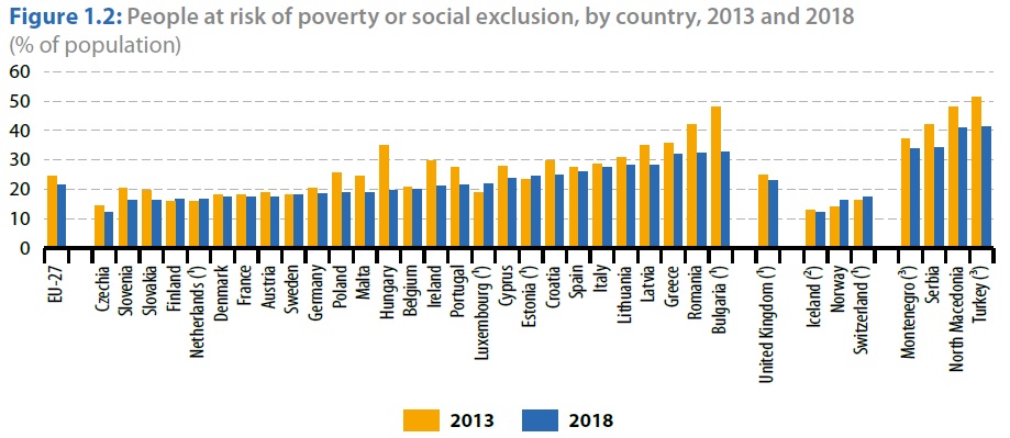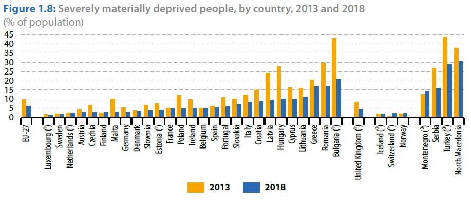 Pe primul loc în acest top negru al sărciei severe erau vecinii noștri bulgari, cu un procentaj de peste 20%, în anul 2018, dar și ei au făcut progrese considerabile față de 2013, când aveau aproape 45%.