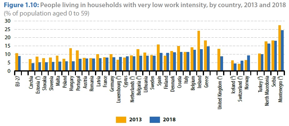 Prin gospodării cu intensitate scăzută a muncii, Eurostat înțelege acele gospodării în care adulții au lucrat cel mult 20% din potențialul lor în ultimul an. Grecia, Irlanda și Belgia aveau în 2018 cele mai mari ponderi ale oamenilor de până în 59 de ani care trăiau în familii ai căror membri nu prea se duceau la lucru.