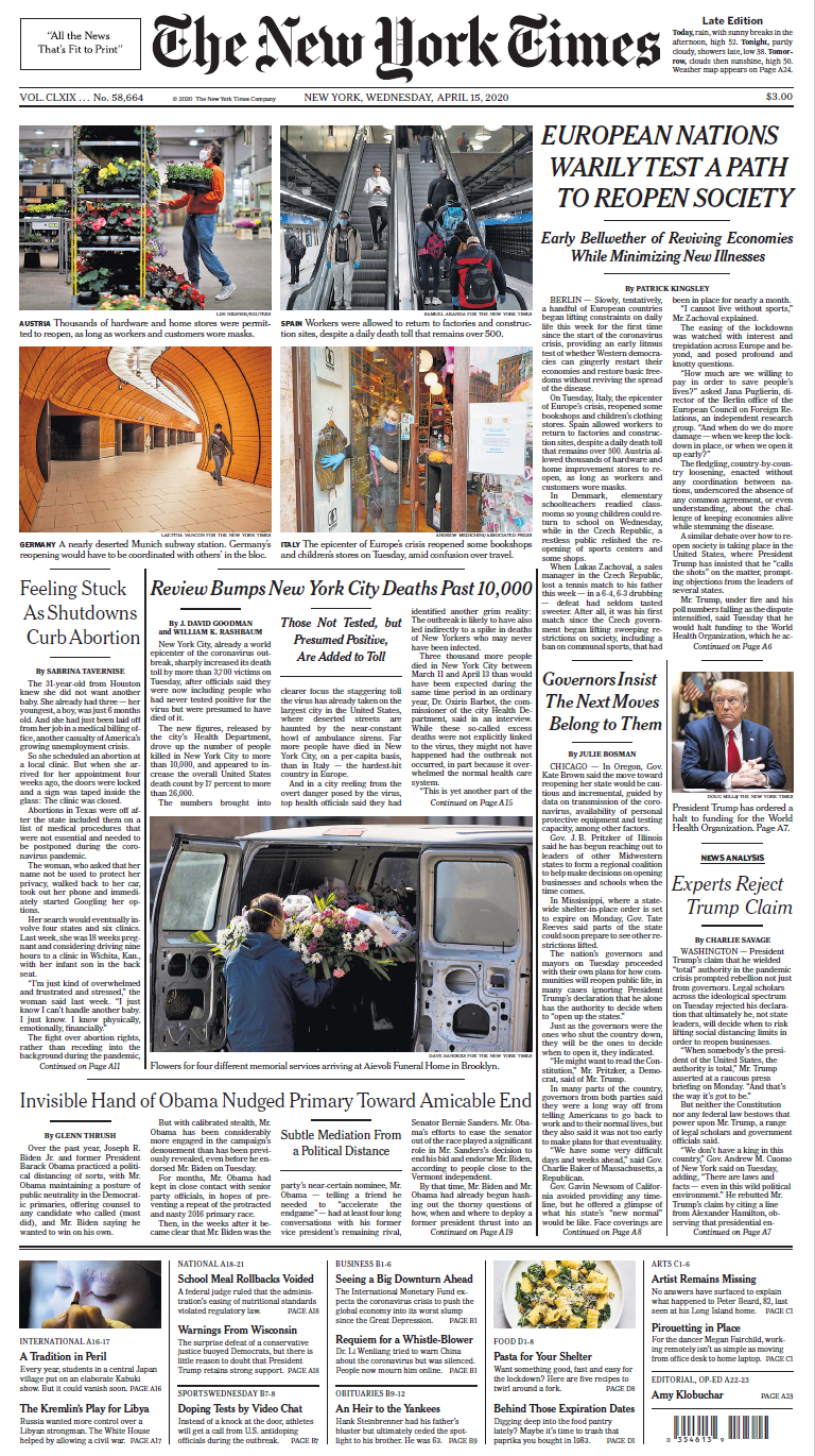 Sunt un sceptic, ca s-o spun moderat, în privința celor sceptici la adresa interdicțiilor de circulație și distanțării sociale. În cel mai bun caz ei pledează pentru mai multă viteză și optimism în privința redeschiderii, în contrast cu ideea că ar exista un univers paralel în care economia americană ar rămâne funcțională și stabilă în timp ce virusul ucide săptămânal mai mulți oameni decât accidentele rutiere, gripa sau cancerul, iar bilanțul lunar al deceselor din New York îl întrece pe cel din septembrie 2001.
