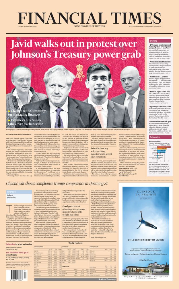 Brusca sa plecare, survenită la doar opt luni după numire, perturbă planurile pe tema bugetului ţării, care ar urma să fie finalizate pe 11 martie. Dl Javid a fost imediat înlocuit cu Rishi Sunak, aliat apropiat al premierului, care a acceptat planul prin care dl Johnson doreşte să preia controlul asupra acestui birou. Potrivit unor surse oficiale de la Whitehall, joi dimineaţă, dl Javid a discutat timp de o oră cu premierul, dar a refuzat cererea acestuia de a-şi demite echipa de consilieri.