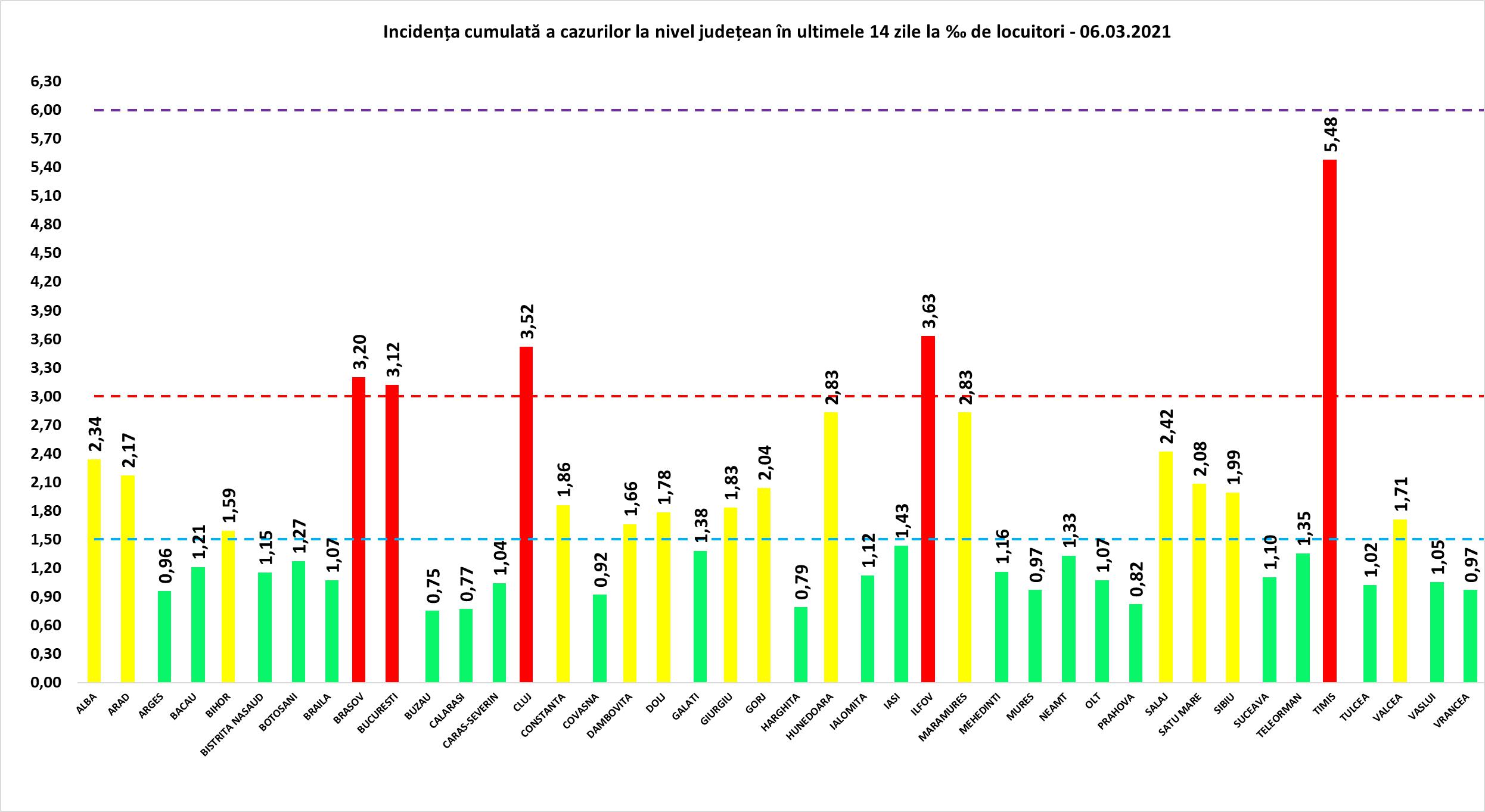 Rata de infectare crește în București, potrivit datelor oficiale aceasta fiind sâmbătă de 3,12 față de 3,05 cu o zi înainte. Județul Timis conduce în top cu o incidență cumulată a cazurilor la mia de locuitori de 5,48. Rate de infectare peste 3 sunt raportate în județele Cluj – 3,52 și Brașov -3,20.