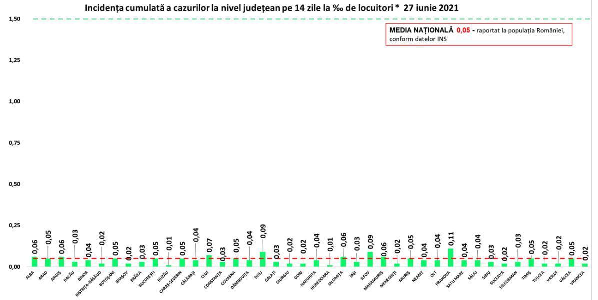 La nivel național, rata de infectare este de 0,05 cazuri la mia de locuitori, incidență la 14 zile.