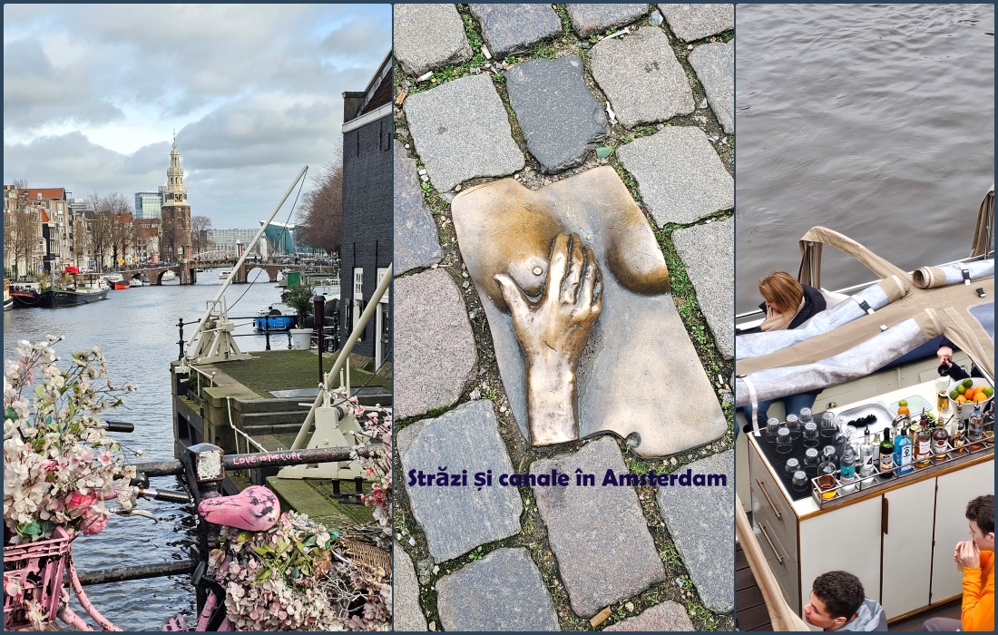 Cam acestea sînt cele trei lucruri diferite, prin mărime și unicitate, de alte destinații. Nici nu cobori bine din autobuzul 397 care te aduce de la aeroport în centru și dă biciclistul peste tine. Dacă plouă și stai sub umbrelă sau cu gluga, și nu ești ultraatent, ai pus-o. Nu când treci tu aiurea. Ci, chiar pe la locurile marcate. Mi-am adus aminte de agresivitatea șoferilor de la noi. Este posibil, ca aici, ea să se fi mutat la bicicliști, mașini nu prea mai sînt. Însă, tot n-am înțeles. Au scăpat de mașini cu niște prețuri de parcare că poți să-ți iei direct elicopter și, acum, trotuarele se blochează cu biciclete și scutere, pentru că, obiceiul șoferilor de a parca în ușa magazinului sau restaurantului, poarta casei, s-a translatat la bicicliști. Într-una din seri, pur și simplu, poliția nu făcea față să elibereze trotuarul. Trebuia să o iei pe carosabil, unde, bineînțeles, dădeau mașinile peste tine. Nu mi-a venit să cred că, ce nu mi s-a întâmplat în București, mi se va întâmpla în Amsterdam, să fiu lovită de mașină. Sigur, trebuie să dispari din astfel de zone, băieții/fetele fiind ori cu alcoolul, ori cu doping-ul peste limită. Dar, trecând peste acest aspect, trebuie să admit că este pentru prima dată când văd populația unui întreg oraș într-o formă fizică de invidiat. Cred că și măsurile hainelor sînt puțin altfel, cel puțin din ce am probat eu. Impresionant. Această Veneție a nordului este raiul plimbărilor nautice. Nu am încercat de această dată din lipsă de timp. Marele tur! costă 13 euro și par a fi cu adevărat deosebite când prinzi și vreme frumoasă, soare. Mai sînt și mini boaturile pentru grupulețe, unde băutura e la discreție, și, posibil și ceva recreațional. Pe vreme noroasă erau și cele mai folosite, chiar și seara. Au rămas și acestea on hold. Casele cu pantă. De două feluri. Pe cele cu înclinația spre stradă m-am lămurit (mai târziu în text). Cele care erau aplecate spre casa vecină lipită nu prea am înțeles de ce sau cum. Adică, așa s-a vrut sau așa a ajuns. Mâncarea…și băutura. Nu prea multe. Să nu uităm, e oraș turistic. Însă. Sînt niște vitrine cu dulciuri și prăjituri că îți vine să intri direct în ele. Mâncare europeană de toate felutile, zic ei. Eu ca de obicei, am mizat pe italienească (old habits, die hard) care mi s-a părut cam pârâtă. Japonismele și chinezismele sînt și ele de la sine înțelese. Despre bere nu sînt eu în măsură să comentez, dar aici e mai simplu că exportă ei. Cu transportul urban e cam nașpa. Scump. Ieftin de la aeroport în centru, chiar și mai mult dacă te încadrezi în timpul alocat, dar, în rest, nu prea se merită. Bicicletă n-am închiriat cî m-am descurcat cu mersul pe jos. Într-una din zilele ploioase am luat totuși metroul de la operă. Imensități de stații, vagoane generoase, îți cari și bicicleta, care, automat, cer tuneluri mai mari, stații mai mari, care consumă și mai mult să le încălzești. Nicio grijă, nu le încălzesc. Deloc. Oricum, aici, ca și la noi, prețul e legat de timp, durata călătoriilor. La Londra, de ex., ești legat de numărul deplasări pe zi și pe zone. Ca la Metro. Cu cât călătorești mai mult, cu atât plătești mai puțin per destinație. Chiar și așa, o călătorie la Londra e mai ieftină ca la Amsterdam. Probabil, că există facilități, eu mă refer strict la ce simte turistul la buzunar. Oricum, cred că februarie e o lună bună de vizitat. Nu mi s-a părut cotropit de turiști, temperaturi de plimbări. Iar zăpadă se vede atât de rar, deși, culmea, cu vreo 400 de ani în urmă, patinajul pe canale era la ordinea zilei, cel puțin așa reiese din picturile văzute în Rijksmuseum, Hendrick Avercamp.