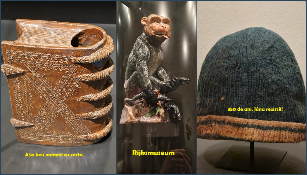 Casa marilor maeștri, cum se autointitulează. Este un muzeu mare, bogat, nu numai de artă, ci și de istorie. Nu poate fi vizitat într-o zi, iar spre deosebire de Luvru, n-ai biletul valabil două zile. Nici audio ghidul, și scump (6,50 euro), nu te prea ajută. Destul de „subțire” în comparație cu vasta colecție și în comparație cu ce se oferă de obicei. Asta e, n-am știut. Înăuntru, raiul pe pământ. Colecțiile inteligent desenate, istorie cu artă, artefacte, colecții speciale extraordinare. Toată lumea știe despre ”Mona Lisa” Amsterdamului, „Rondul de noapte” a lui Rembrandt van Rijn, care, din motive de securitate a ajuns destul de greu de văzut. Sticla protectoare reflectă diversele surse de lumini, vitralii sau spoturi, iar singura șansă este să vezi de aproape, dar pierzi perspectiva. Pentru cei din lumea artei e foarte bine că pot vedea de aproape tușele maestrului, însă, în general, simplii consumatori își doresc felia întreagă. În astfel de locuri, e valabil și la Luvru, și nu numai, te poate bântui întrebarea, de ce s-a făcut fixație doar pe această pânză, când muzeul are o super colecție, și cu Vermeer, și cu alte Rembrandt-uri, ca să nu încep să înșirui și alte nume? E adevărat că, din perioada aproximativ concordantă, sînt mai prietenă cu Peter Paul Rubens. Asta nu înseamnă că nu mă topește geniul Rembrandtian, sau că nu îi recunosc contribuția la evoluția artelor plastice, probabil, cel mai mult dintre toți. Dar, cum spuneam, este un muzeu complex de istorie. Palpezi obiceiurile trecute, umorul, cultura… Cu artefacte începând de la recipiente de băuturi, de lux și populare, gen „Așa beu oameni cu carte”!, până la sofisticate vase ce imită morile de vânt. Sau. Căciuli de lână păstrate în perfectă stare, pot fi purtate și acum, provenind din mormintele de peste 350 de ani ale vânătorilor de balene, ce-i drept, aflate la temperaturi sub 0 grade. Zic eu, cea mai bună reclamă pentru produsele din lână, asta dacă admitem că și grăsimea de balenă joacă un rol. Mi-am adus aminte de grăsimea de gâscă cu care îmi întrețineam bocancii de munte. Sau, în compensație, pentru cei care încă mai cred că celebrul pește ce trona pe tv-uri e un kitsch sau piticul din grădină, le recomand să vadă văcuța bibelou (cu suport pentru televizor) sau maimuțica din grădină(sic!). Nu, nu sînt kitsch-uri, niciunele. Problema e mai complexă, cine vrea să nu rămână prost, mai plastic, ignorant, trebuie să studieze, să vadă. În fine, sînt nenumărate comori ascunse pe-acolo. Recomand, acum, altora, ce mi-ar fi prins bine și mie. Dacă știi că vei ajunge acolo, nu precupeți efortul de a consulta site-ul muzeului înainte. E foarte bine făcut și te ajută să vezi mai multe la fața locului. Și programează din start 2 zile, minim. Dar nu rata!