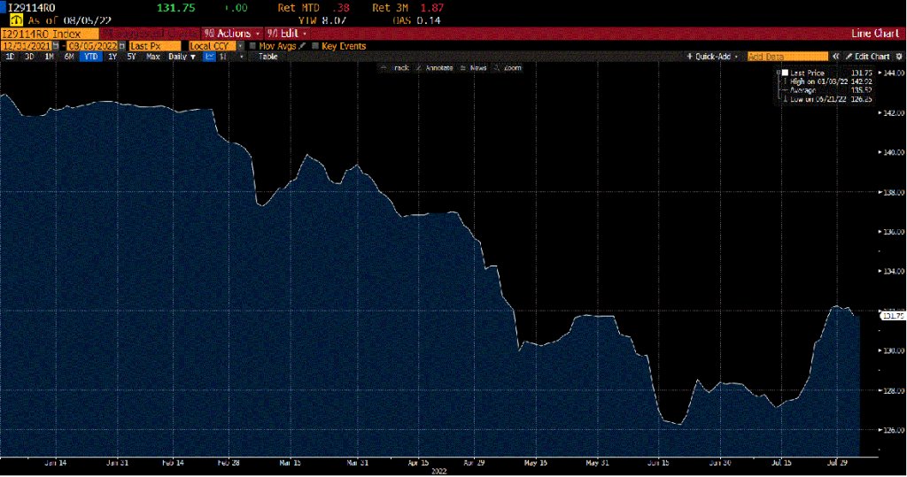 Ca si in cazul scaderilor, si in acest caz, influenta majora provine din evolutia titlurilor de stat care au o pondere de aproximativ 60% in portofoliul fondurilor de pensii. Graficul de mai jos arata evolutia indicelui care reflecta miscarile preturilor titlurilor de stat.