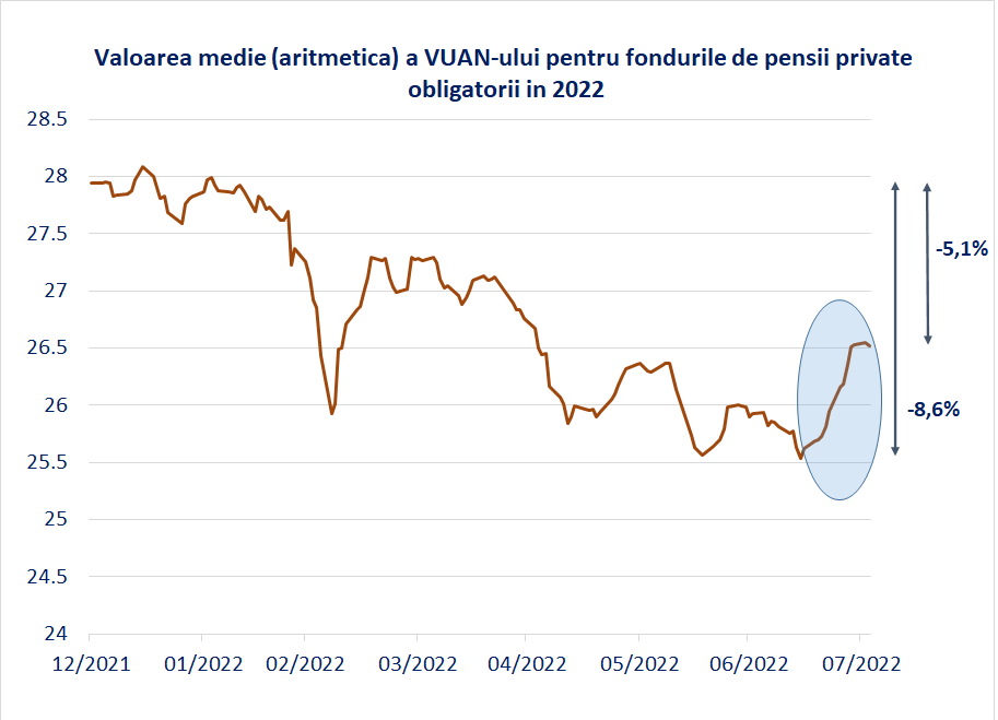 Si acum situatia la zi. Graficul de mai jos ne arata faptul ca, dupa ce la mijlocul lunii iulie, media aritmetica a valorii unitatii de fond in pilonul doi scazuse cu 8,6% fata de prima zi a anului, ieri, scaderea se micsorase la 5.1%.