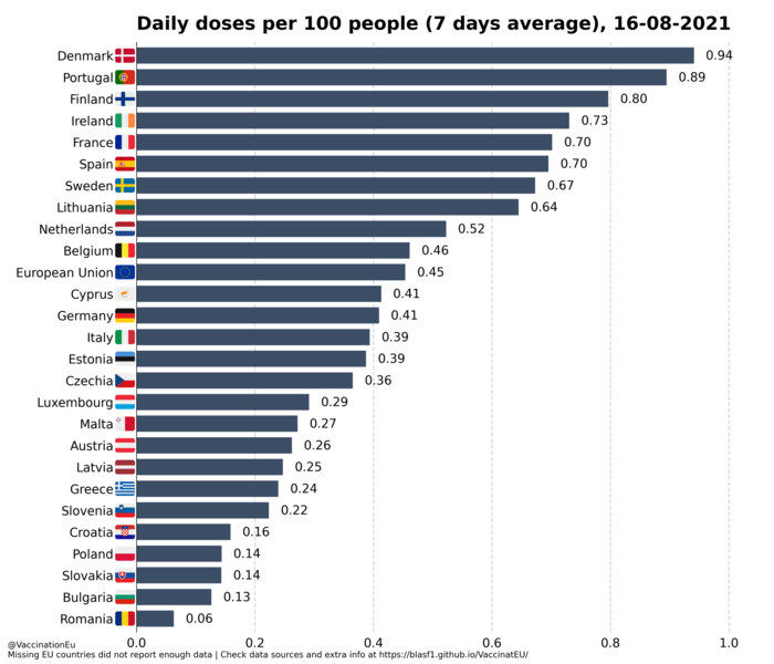 Malta se află e primul loc la procentul populației vaccinate cu 79,1%, Portugalia pe doi cu 75,5% și Danemarca pe trei cu 74,2%.