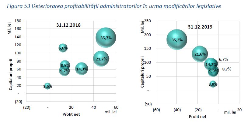 - „Dacă la finalul anului 2018 șase administratori înregistrau profituri nete în valoare 169 de milioane de lei, cu o rentabilitate a capitalurilor cuprinsă între 11% și 54.7% în timp ce doar un administrator a obținut o pierdere de -4.9% din capitalurile proprii, la finalul anului 2019 toți administratorii au avut pierderi cumulate de 84 de milioane de lei, reprezentând între -4,9% și 24,3% din capitalurile proprii.„, se menționează în raport.