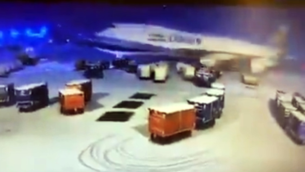Potrivit unui martor de la fața locului care a trimis imagini paginilor de pasionați de pe social media, avionul rula spre un loc de parcare, la scurt timp după aterizare, dar din pricina zăpezii care s-a acumulat la sol și nu a fost curățată în timp util, echipajul nu ar mai fi văzut linia centrală după care să ghideze aeronava, a deviat și a lovit mai multe cărucioare de bagaje. Din fericire nimeni nu a fost rănit, însă două din cele patru motoare ale aeronavei au suferit daune.