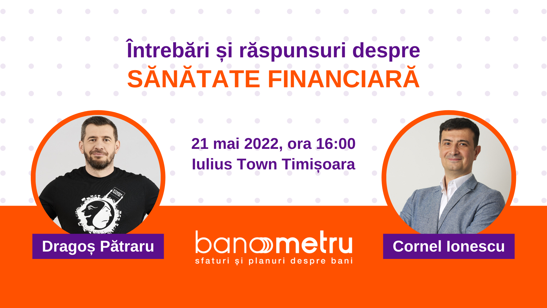 Pe 21 mai, începând cu ora 16:00, va avea loc un eveniment special în cadrul Iulius Congress Hall din Iulius Town, sala Verdi, etajul 1, în care Dragoș Pătraru de la Starea Nației și Cornel Ionescu, coach Banometru vor vorbi despre bani și provocările financiare pe care oamenii le pot întâlni de-a lungul vieții. La finalul conversației, Cornel și Dragoș vor răspunde la întrebările participanților despre cheltuieli, venituri, datorii, rate și tot ce ține de finanțele personale. Participarea la eveniment este gratuită pe bază de înscriere la fața locului, locurile fiind limitate.