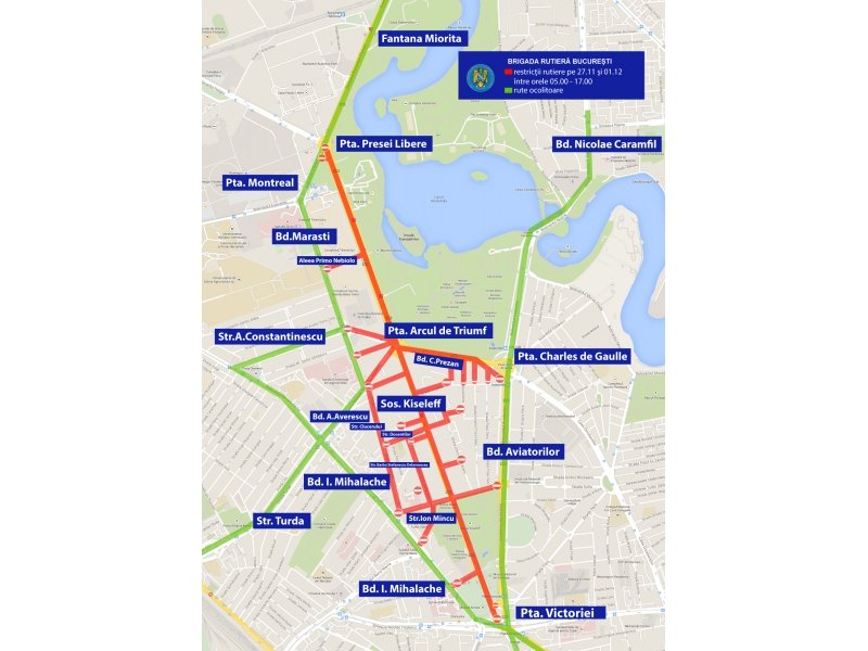 - blocarea traficului pe Bdul Mareşal Alexandru Averescu, între Bdul Mărăşti şi Piaţa Arcul de Triumf, precum şi pe străzile adiacente;