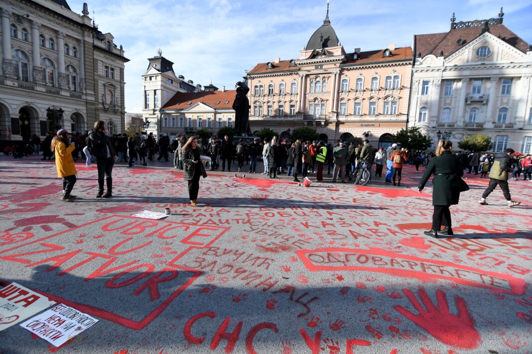 Mesaje antiguvernamentale în Novi Sad la 1 decembrie 2024, la un protest la o lună după drama de la gara din Novi Sad. Foto: Profimedia