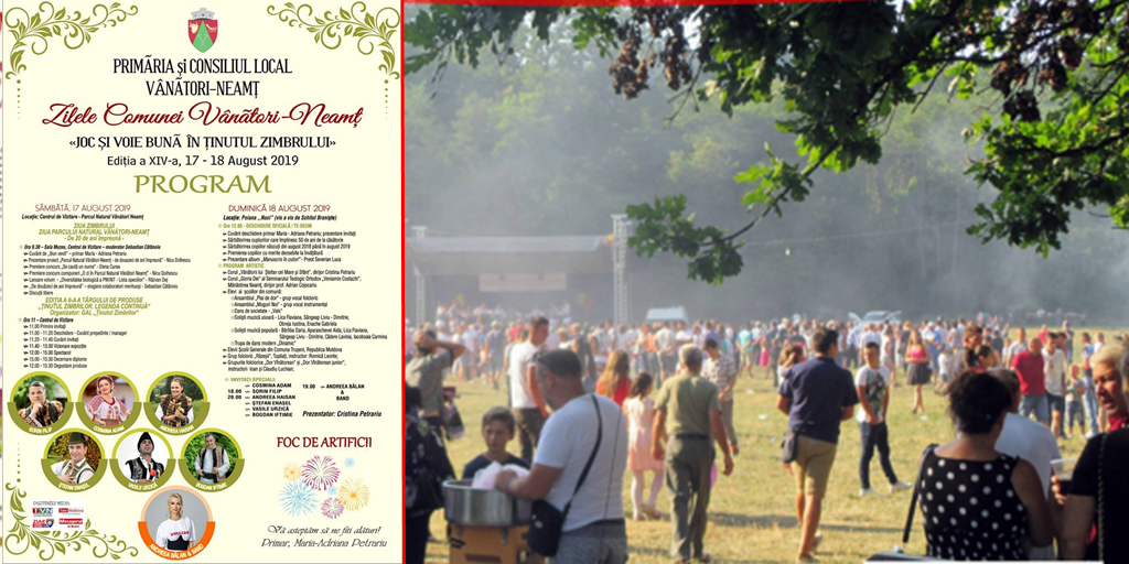 Acolo, de la ora 13.00, vor fi oficial deschise Zilele comunei Vânători-Neamț, prin cuvântul primarului Maria Adriana Petrariu. După prezentarea invitaților prezenți la eveniment, vor fi sărbătorite cuplurile care împlinesc, în 2019, 50 de ani de la căsătorie. Organizatorii premiază și nou-născuții din comună, dar și copiii cu merite deosebite la învățătură.