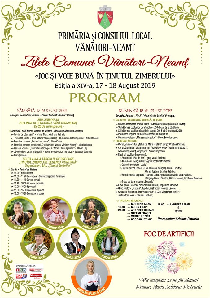 Sărbătoarea din inima Ținutului Zimbrului va continua cu un bogat program artistic. Rând pe rând, pe scenă vor urca talente locale: Corul „Vânătorii lui Ștefan cel Mare și Sfânt” (dirijor Cristina Petrariu), Corul „Gloria Dei” al Seminarului Teologic Ortodox „Veniamin Costachi” de la Mănăstirea Neamț (dirijor prof. Adrian Cojocariu), elevi ai școlilor din comună (Ansamblul „Plai de dor”- grup vocal folcloric, Ansamblul „Muguri Noi”- grup vocal instrumental, Dans de societate- „Vals”, soliști de muzică ușoară- Flaviana Lica, Liviu Sângeap, Iustina Obreja, Gabriela Enache), soliști de muzică populară (Daria Bîrliba, Aida Apareschevei, Flaviana Lica, Liviu Sângeap, Lavinia Cădere, Carmina Iacoboaia), Trupa de dans modern „Dinamic”.