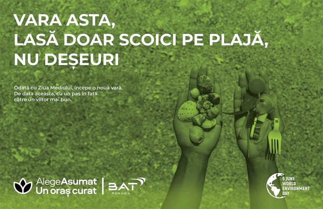 Cu ocazia zilei de 5 iunie – Ziua Internaţională a Mediului, care coincide cu începutul noului sezon estival, BAT România demarează în cadrul platformei Alege Asumat un Oraş Curat o nouă campanie de conştientizare a faptului că gesturile individuale simple pot avea un impact semnificativ asupra mediului înconjurător. Astfel, noua campanie îndeamnă turiştii la eco-responsabilitate în timpul vacanţelor şi la menţinerea curăţeniei apelor şi pe plaje, cu mesaje precum: “Vara asta, lasă doar amintiri la mare, nu deşeuri” sau „Vara asta, lasă doar urme pe nisip, nu ambalaje,” amplasate pe Autostrada Soarelui, dar şi prin mijloace de comunicare media şi online.