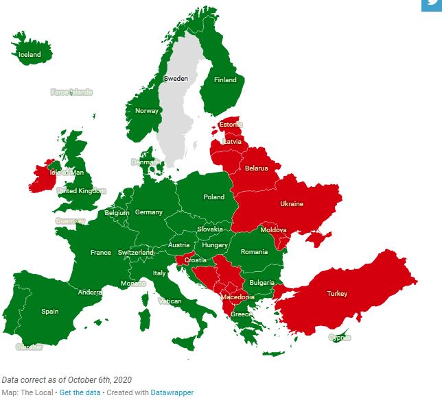 Nu arată ce restricții au aplicate diferite țări pentru călătorii din Suedia sau dacă trebuie să fii în carantină sau să fii testat la sosire.