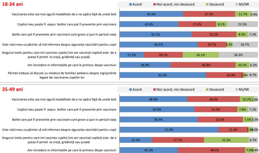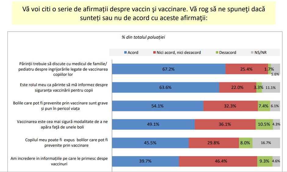 „Cercetarea sociologică relevă o atitudine ambivalenta neclară a unei părţi a populaţiei faţă de vaccinuri şi vaccinare, ceea ce reflectă faptul că percepţiile raţionale asupra acestui subiect sunt viciate semnificativ de o serie de mituri care alimentează neîncrederea şi impun necesitatea unor campanii solide de informare şi educare, mai ales a tinerilor, cu privire la rolul pozitiv al vaccinării asupra sănătăţii publice. Majoritatea românilor sunt de acord cu vaccinarea, procentul concetăţenilor noştri care refuză vaccinul şi vaccinarea fiind foarte mic. Există însă un segment de populaţie semnificativ care nu este pe deplin convins de principiile vaccinării, ezitant, acest segment fiind probabil cel mai vulnerabil la eventuale mesaje antivaccinare”, au precizat autorii.