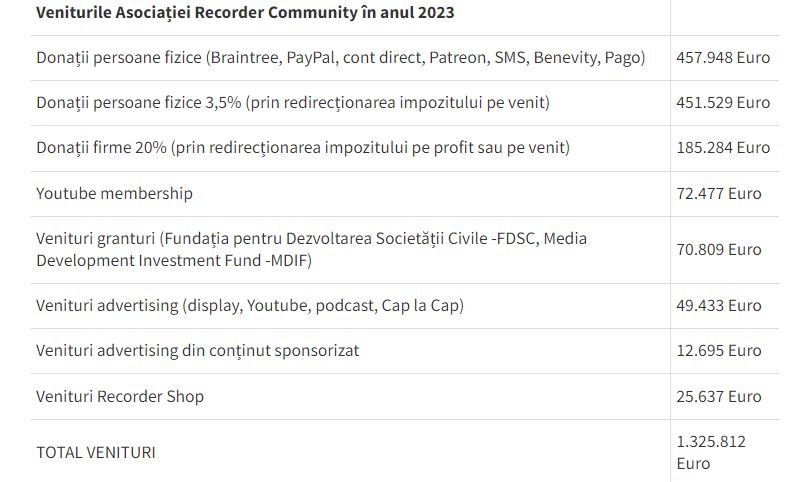 În anul precedent, Recorder a generat venituri totale de 1.325.812 euro. 90% din aceşti bani au venit din donaţii, în timp ce restul au fost generaţi din granturi (5%) şi advertising (5%), notează recorder.ro. Între timp, echipa a ajuns la a ajuns la 25 de oameni.