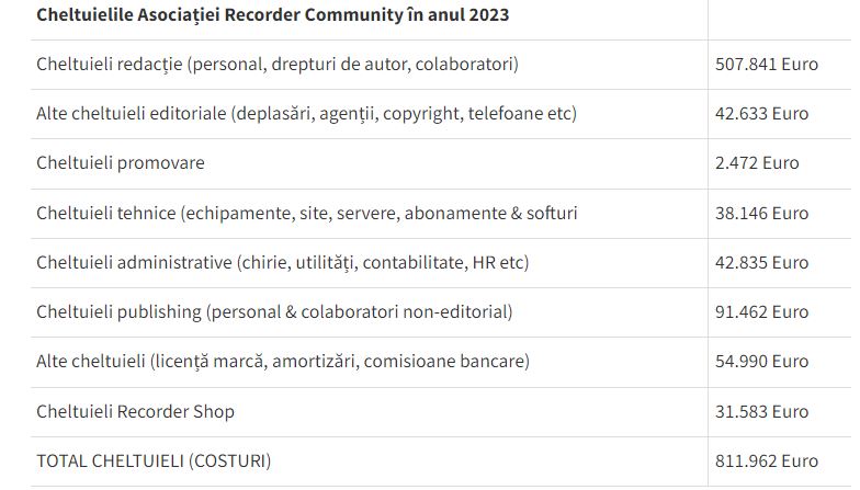 În 2023, cheltuielile Recorder au crescut cu 35% față de anul anterior, principalul motiv fiind creșterea numărului de membri din redacție, salariile angajaților reprezentând cea mai mare proporție a cheltuielilor anuale.
