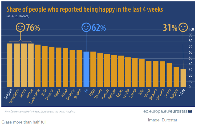 Un sondaj efectuat de Eurostat în 2018 a evidențiat că aproape jumătate din europenii trecuți de 16 ani sunt fericiți majoritatea timpului, în timp ce 14% se declară permanent fericiți. Oamenii au fost rugați să spună cât timp au fost fericiți în ultimele patru săptămâni înainte de sondaj, precizând unde se află în cinci categorii – de la „tot timpul” la „nici un moment”.