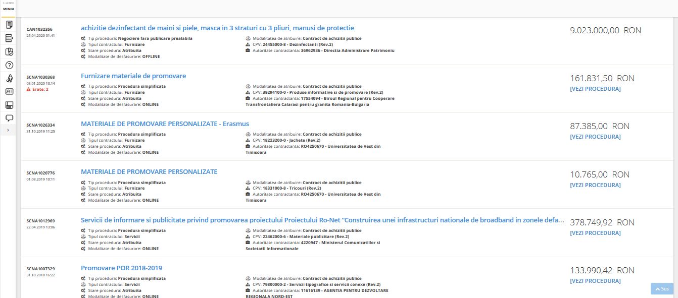 În baza acordului cadru au fost încheiate două contracte subsecvente pe perioada decretării stării de urgență conform Decretului nr. 195/2020 publicat în Monitorul Oficial nr. 212/16.03.2020 și Decretului nr. 240/2020 publicat în Monitorul Oficial nr. 311/14.04.2020.
