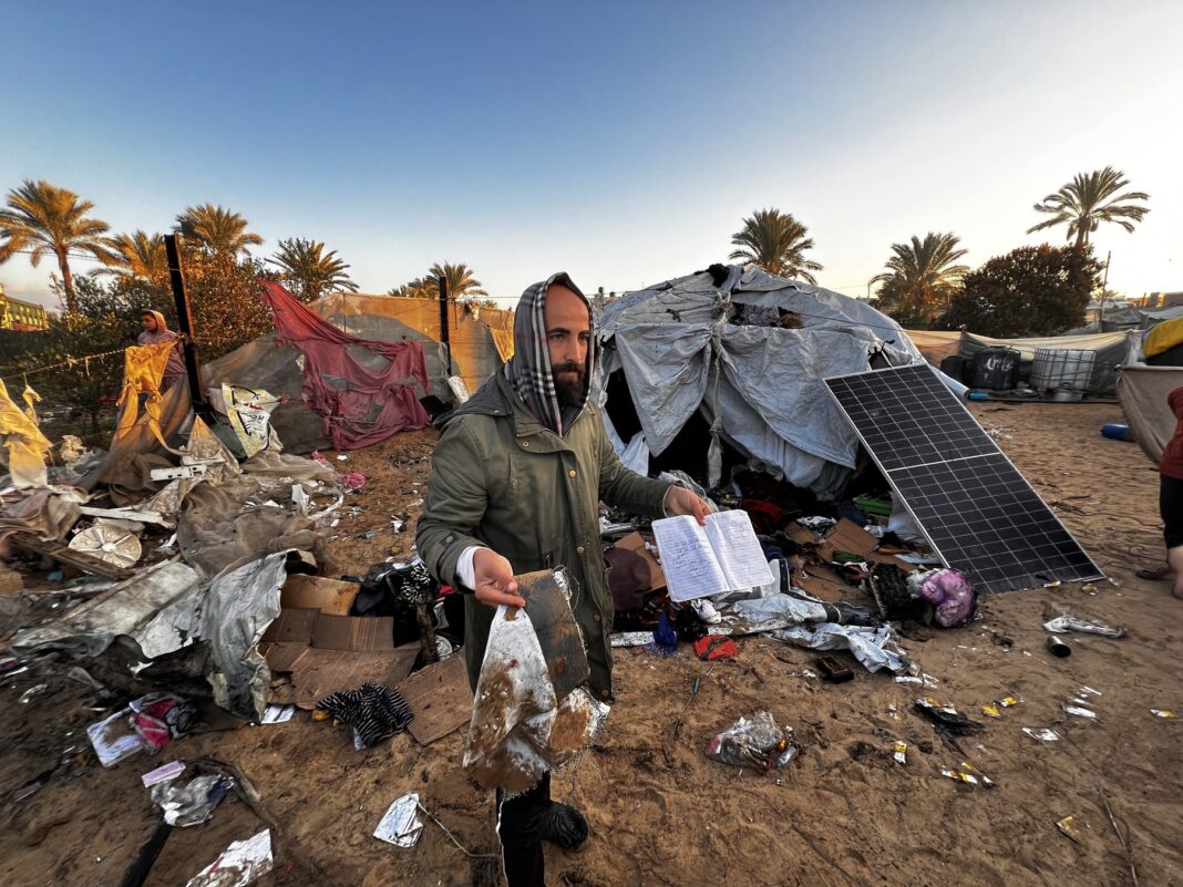 Atacurile israeliene asupra Gazei au continuat în pofida anunțului privind acordul de încetare a focului. O zonă de corturi, unde palestinienii strămutați s-au refugiat, distrusă după un atac israelian, în Khan Yunis, Gaza, pe 18 ianuarie 2025. Sursă foto: AA/ABACA / Abaca Press / Profimedia