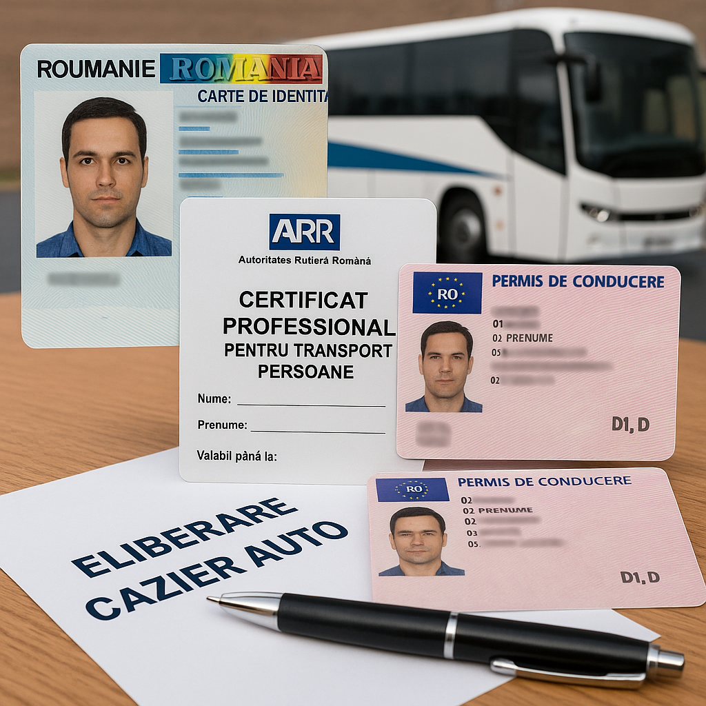 Pentru confirmarea competențelor, dosarul trebuie să includă permisul de conducere categoria D sau D1, valabil și vizibil, precum și atestatul profesional pentru transport persoane (CPI/CPD), conform reglementărilor ARR. În plus, angajatorii cer frecvent copia după cardul tahograf.