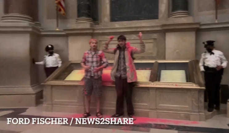 Activişti de mediu au aruncat miercuri, la Washington, cu praf roşu pe geamul care protejează exemplarul original al Constituţiei SUA, îndemnându-l pe preşedintele Biden să declare starea de urgenţă climatică.