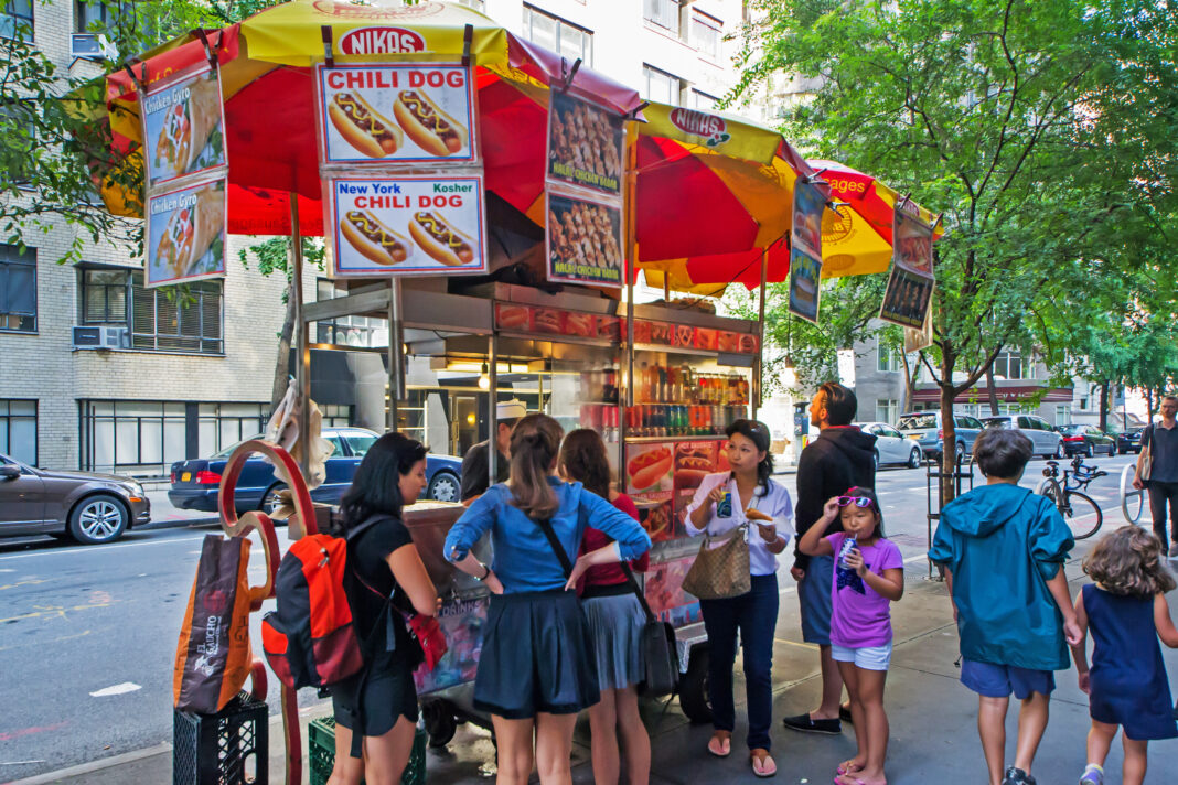 New York City, SUA – 3 august 2013: Oameni la coadă la un chioșc de hot dog din Manhattan. Imagine ilustrativă. FOTO: © Stefano Armaroli | Dreamstime.com
