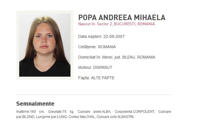 Conform IPJ Buzău, poliţiştii au fost sesizaţi de familia unei minore de 16 ani, din localitatea Merei, judeţul Buzău, Popa Andreea Mihaela, cu privire la faptul că aceasta a plecat în data de 26 ianuarie către şcoală, în municipiul Buzău, fără a mai reveni la domiciliu.
