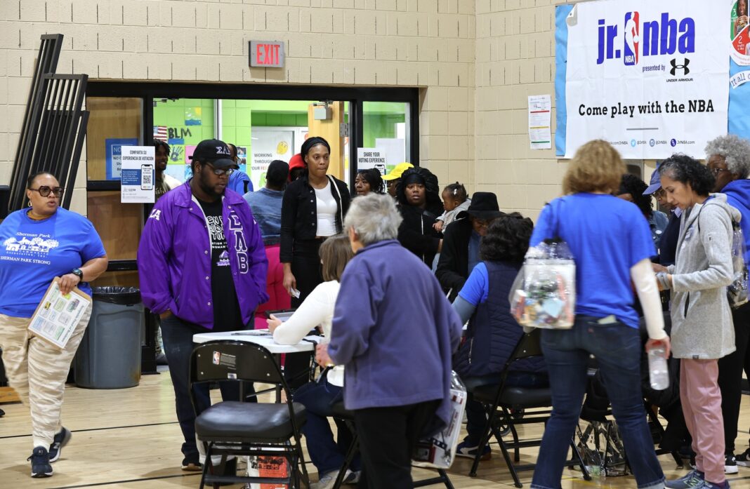 5 noiembrie 2024, Milwaukee, Wisconsin: Oamenii așteaptă la coadă pentru a-și prezenta cartea de identitate la Mary Ryan Boys and Girls Club, înainte de a merge să își ia buletinele de vot.