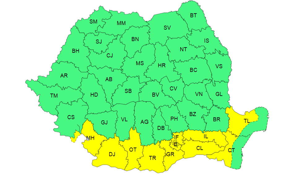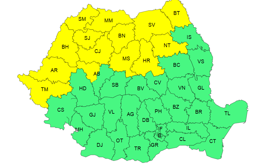 Sub cod galben sunt vizate județe din Maramureș, sudul și estul Transilvaniei, jumătatea de nord a Moldovei, estul și nordul Olteniei și jumătatea sudică a Munteniei. Aici, se vor înregistra temperaturi deosebit de ridicate pentru această dată și va fi disconfort termic. Temperaturile maxime vor fi cuprinse între 30 și 35 de grade.