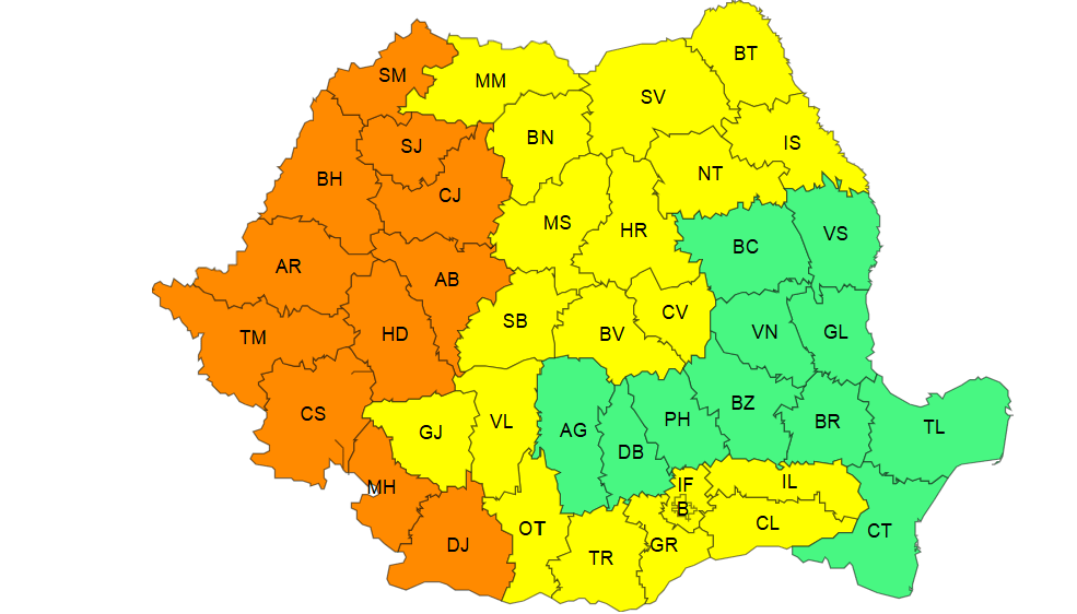 Sub cod portocaliu de caniculă se județe din Banat, Crișana, sud-vestul Olteniei și vestul Transilvaniei. Aici, se vor înregistra temperaturi deosebit de ridicate pentru această dată, maximele se vor situa între 33 și 37 de grade.