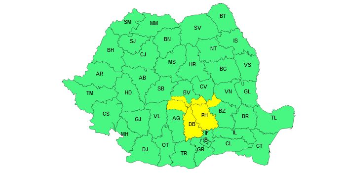 În intervalul 7 decembrie, ora 10 – 8 decembrie, ora 10, în județele Dâmbovița, Prahova și zona de munte a județelor Argeș, Brașov și Buzău vor fi precipitații însemnate cantitativ și se vor acumula în general 25 …35 l/mp.