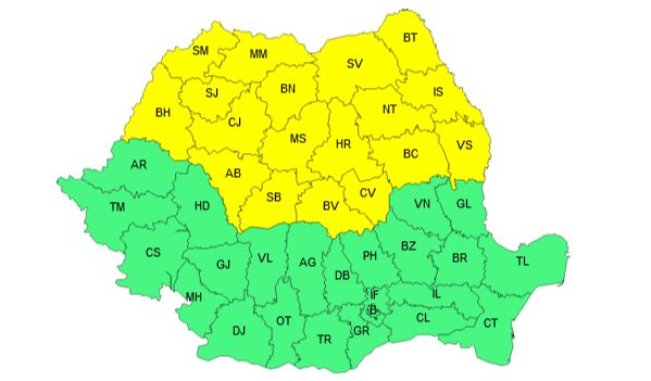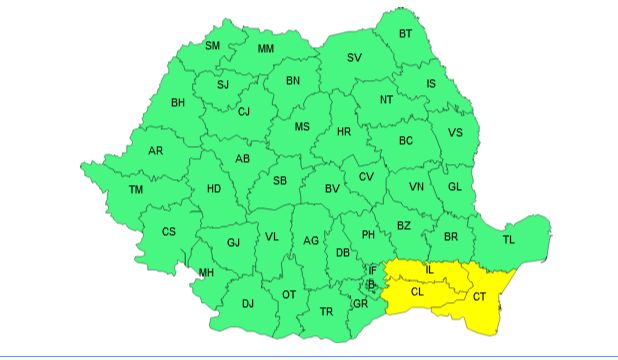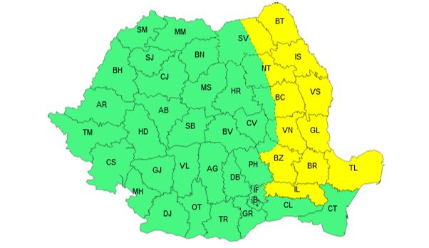 Separat, meteorologii au emis un cod galben pentru perioada 15 februarie, ora 10 – 15 februarie, ora 16, pentru zonele Moldova, nord-estul și estul Munteniei și nordul Dobrogei, unde vântul va avea intensificări cu viteze de 50…65 km/h.
