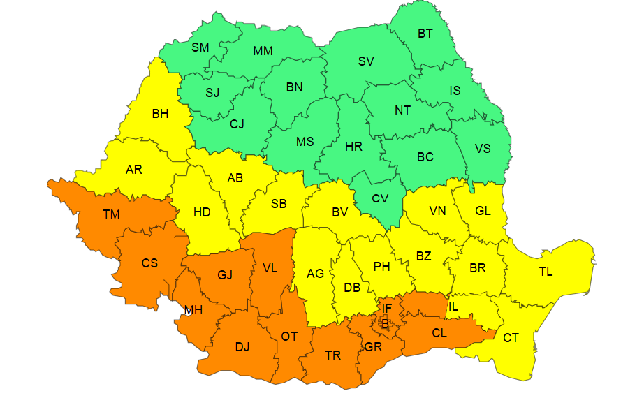 Codul portocaliu de caniculă va viza Banat, Oltenia și jumătatea de sud a Munteniei. Aici, valul de căldură se va intensifica, va fi caniculă, disconfort termic accentuat. Temperaturile maxime vor fi de 38…40 de grade, iar cele minime se vor situa între 20 și 24 de grade, caracterizând o noapte tropicală.