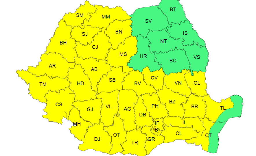 Primul cod galben de caniculă este valabil în intervalul 25 iunie, ora 10 – 26 iunie, ora 10, fiind anunţate val de căldură, caniculă şi disconfort termic ridicat în majoritatea zonelor.