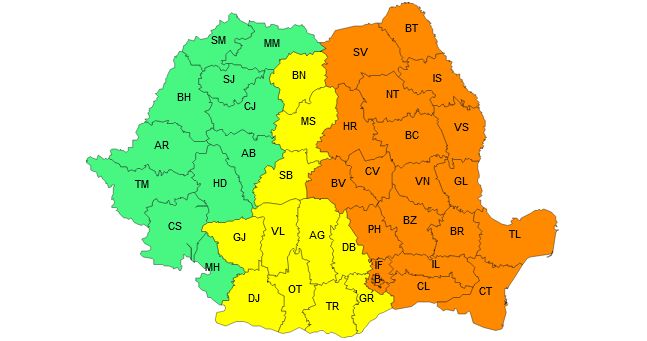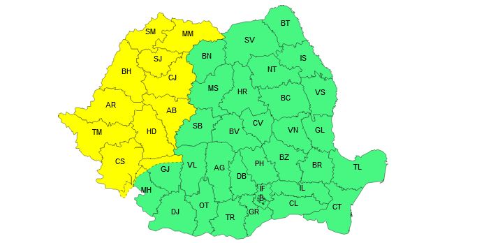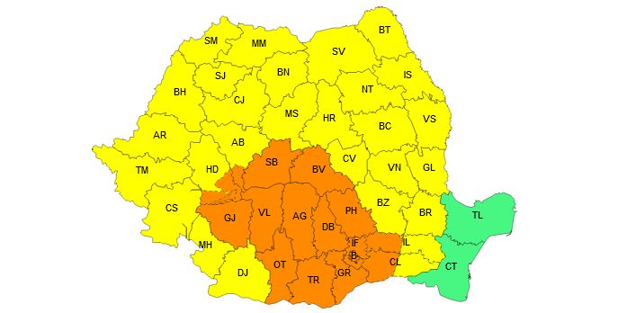 De sâmbătă, 28 septembrie, ora 18, până duminică, 29 septembrie, ora 8, este valabil un cod galben de instabilitate atmosferică și averse însemnate cantitativ.