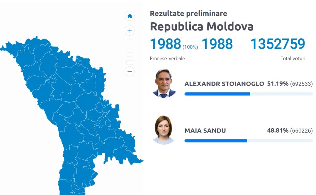 Alexandr Stoianoglo a câștigat votul alegătorilor care locuiesc pe teritoriul Republicii Moldova. În Găgăuzia, a adunat peste 97% / Maia Sandu a câștigat la Chișinău