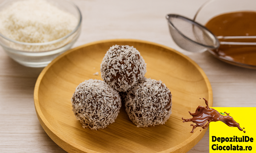 Mod de preparare: Se amestecă toate ingredientele până se obține o compoziție modelabilă. Se formează biluțe și se rostogolesc prin fulgi de cocos. Se păstrează la rece.