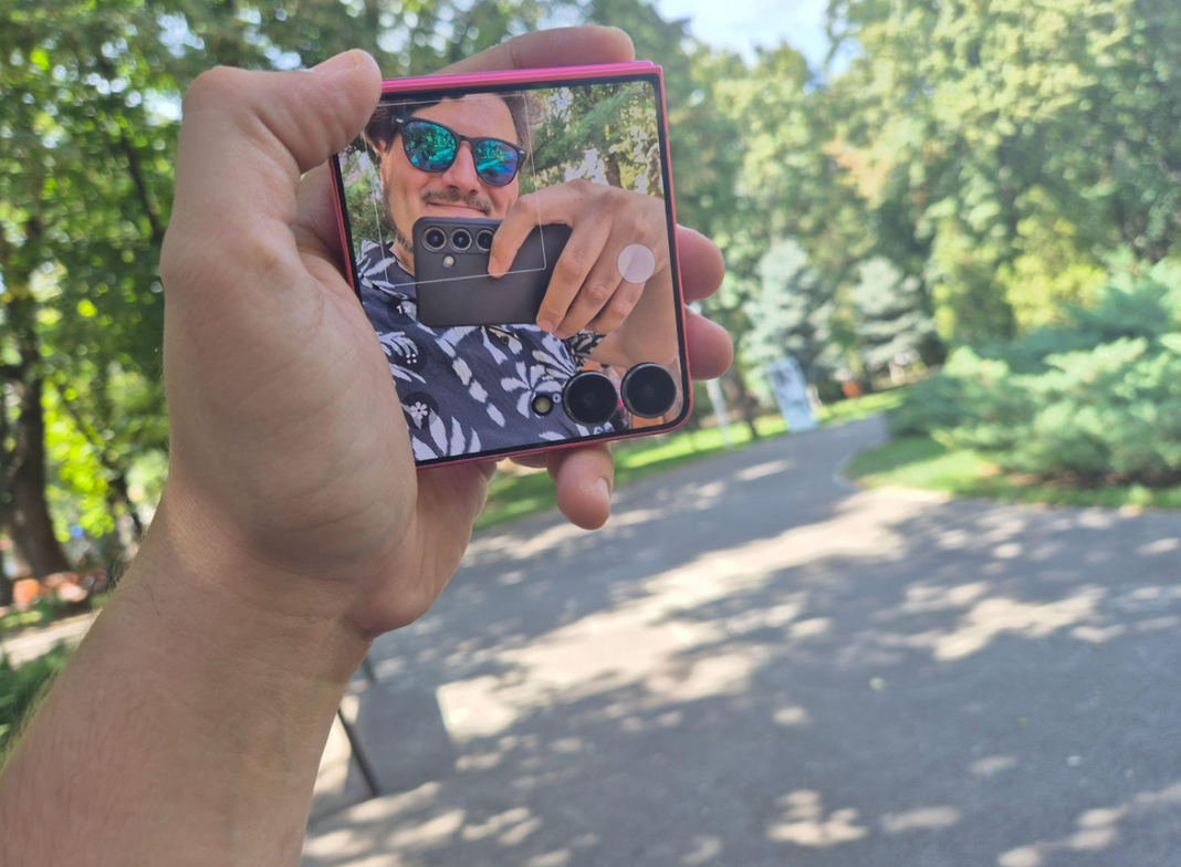 La partea de cameră pentru selfie, ecranul frontalface toată diferența. Am făcut un selfie rapid folosind Dual Preview: eu vedeam rezultatul pe mini-display, în timp real, înainte să apăs pe buton. Camera principală de 50 MP transformă selfie-ul într-un portret de nivel profesional, fără compromisurile unei camere frontale obișnuite. De asemenea ai toate elementele de profunzime ale imaginii pe care le pierzi la alte telefoane când folosești camera din față.