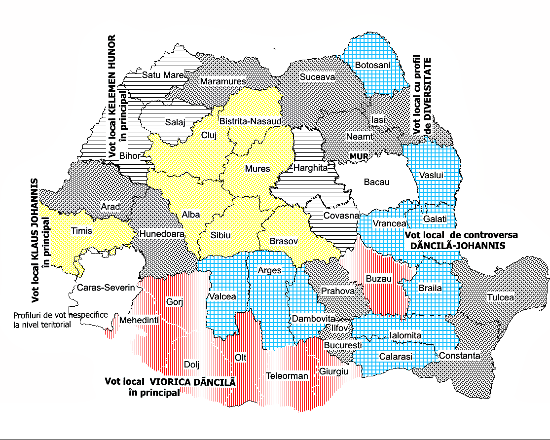 Județele în care au fost predominante localitățile cu vot foarte ridicat în favoarea lui KWJ sunt Sibiu, Brașov, Cluj, Timiș,Mureș și Bistrița-Năsăud. Județele cu localități orientate predominant spre votul pro-Kelemen Hunor sunt, cum era de așteptat, cele în care populația de etnie maghiară are ponderi semnificative. Votul pro-VVD este specific Olteniei, cu excepția județului Vâlcea, plus Buzăul din nordul Munteniei. Nordul Munteniei cu Argeș și Dâmbovița este caracterizat prin ceea ce am denumit ”vot de controversă comunitară”, în sensul de ponderi maxime , de nivel relativ apropiat, pentru VVD și KWJ. Același tip de vot de controversă comunitară este specific județelor din sud-estul Munteniei (Ialomița, Călărași și Buzău) și celor din sud-estul Moldovei (Vrancea, Buzău și Vaslui). Cu aceeași orientare de vot apar și localitățile din Botoșani-Moldova și Vâlcea-Oltenia.