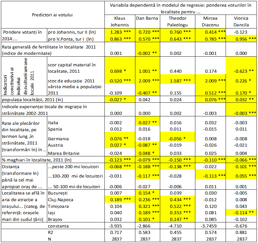 Sursa de date electorale: Biroul Electoral Central. Detalii referitoare la indicatorii componenți ai indicelui dezvoltării umane locale (stoc de educație, capital material, vârsta medie) vezi Heroiu et al. , 2014, anexa IX. Detalii asupra indicilor de modernitate locală sunt disponibile în Sandu 2015. Bazele de date folosite pentru dezvoltarea umană locală și modernitatea locală sunt disponibile aici. Fiecare coloană de date din tabel prezintă câte un model de regresie multiplă de tip OLS (prin metoda celor mai mici pătrate). Variabilele dependente sunt ponderi ale voturilor favorabile candidatului de referință, transformate prin logaritmare (ln). Nivelurile de semnificație ale coeficienților de regresie parțială nestandardizați sunt semnificate prin numărul de asteriscuri: * 0.05, ** 0.01, *** 0.001. Toți coeficienții statistic semnificativi sunt marcați și prin umbrire. Rulare în STATA cu opțiunea cluster pentru controlarea interdependenței între unitățile teritoriale din același județ.