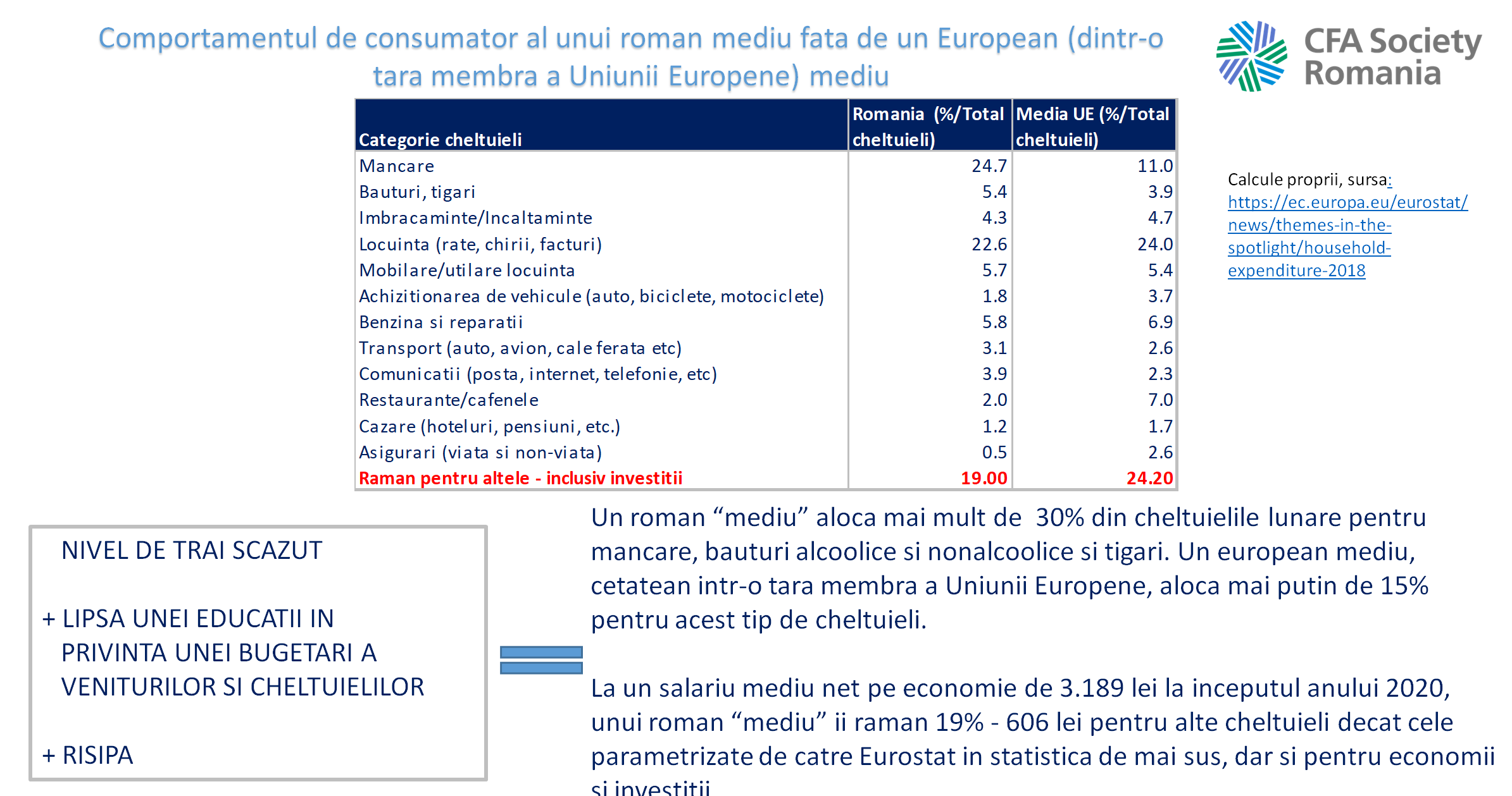 ”România are o alocare foarte ineficientă în privința unei familii medii. Noi alocăm 30% din cheltuieli pentru necesități de bază- mâncare și băutură în vreme ce europeanul mediu cheltuiește sub 15% din cheltuieli. Nivelul nostru de trai e destul de scăzut și asta se vede în modul în care trăim. Trăim foarte mult în prezent. Aproape că trăim ca să mâncăm, fără să ne preocupe viitorul”, a spus marți seara la conferință online Andreea Nica, CFA, membră în Consiliul Director al Asociației CFA Romania.